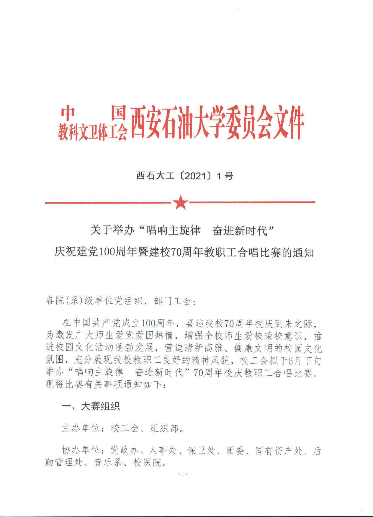 【工会工作】关于举办“唱响主旋律 奋进新时代”庆祝建党100周年暨建校70周年教职工合唱比赛的通知
