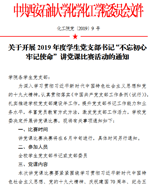 【党建工作】关于开展2019年度学生党支部书记“不忘初心 牢记使命”讲党课比赛活动的通知