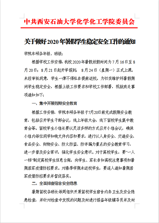 【学生工作】关于做好2020年暑假学生稳定安全工作的通知