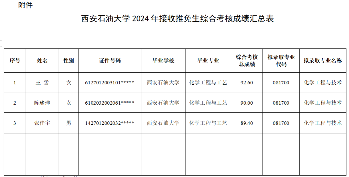 根据《yl8858永利集团推荐、接收优秀应届本科毕业生免试攻读硕士学位研究生管理办法(修订)》(西石大研〔2021〕227号)、《yl8858永利集团化学化工学院2025年推免生综合评议加分实施细则(试行)》和《yl8858永利集团接收2025年优秀应届本科毕业生免试攻读硕士学位研究生的通知》要求,经学生申请、学院复试,最终确定我院拟接收推免生名单如下: